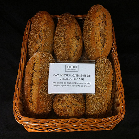 pão rico em fibras e com alto valor nutritivo. sabor intenso, encorporado com suave acidez. o miolo é denso e areado, mantendo uma certa leveza. a crosta é firme e crocante, salpicado com sementes de girassol. sua composição consiste em 50% farinha de trigo, 50% farinha de trigo integral, água, sal e semente de girassol.