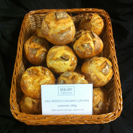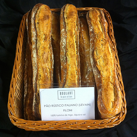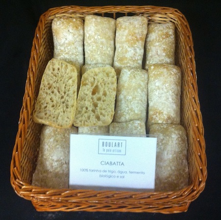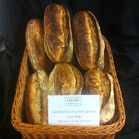 pão rústico, elaborado com uma massa super hidratada, cria uma textura leve com aberturas grandes e irregulares. por fora, uma fina crosta com delicada crocância, levemente dourada e polvilhado com farinha. sua composição consiste em 100% farinha de trigo, água, sal e fermento biológico.